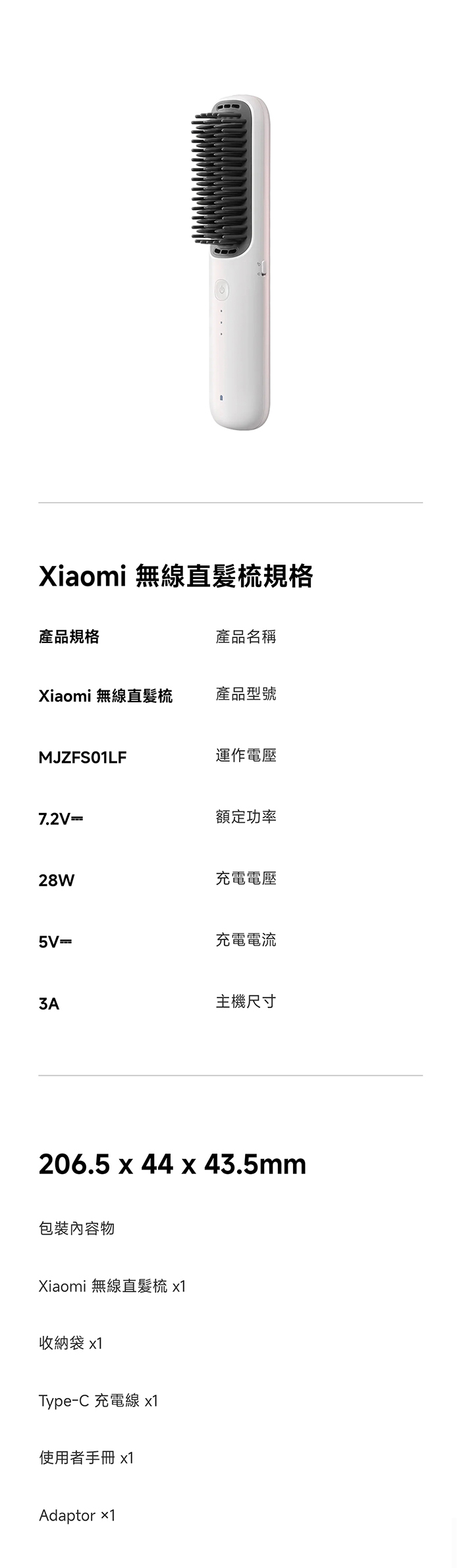| 內容物 | Xiaomi 無線直髮梳 x1 收納袋 x1 Type-C 充電線 x1 使用者手冊 x1 保固聲明 x1 |