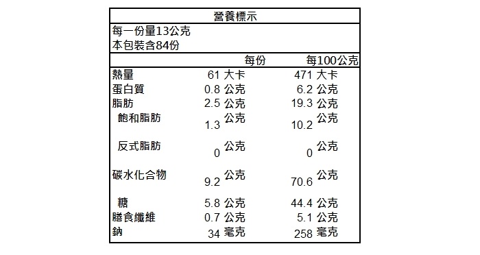 過敏原資訊 本產品含有牛奶.麩質穀物.雞蛋.大豆.堅果類及其製品,不適合對其過敏體質者食用。