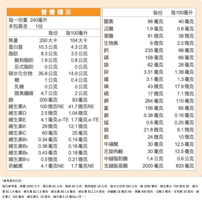 | 內容物(完整成份/食品添加物) | 水、麥芽糊精、乳清蛋白、芥花油、牛奶蛋白、難消化性麥芽糊精、菊苣纖維、中鏈三酸甘油酯、分離大豆蛋白(分離大豆蛋白、卵磷脂)、卵磷脂、豌豆蛋白、果寡糖、檸檬酸鉀、綜合礦物質(碳酸鈣、磷酸鎂、麥芽糊精、焦磷酸鐵、硫酸鋅、磷酸鈣、硫酸錳、硫酸銅、三氯化鉻、鉬酸鈉、碘化鉀、硒酸鈉)、碳酸鈣、乳酸硬脂酸鈉、綜合維生素(維生素C、麥芽糊精、維生素E、本多酸鈣、菸鹼醯胺、維生素A、維生素B1、維生素D3、維生素B6、維生素B2、D-甘露醇、葉酸、生物素、維生素B12)、氯化膽鹼、維生素C、檸檬酸、氯化鈉、鹿角菜膠(鹿角菜膠、蔗糖)、多磷酸鈉、磷酸氫二鉀、氧化鎂、牛磺酸、結蘭膠、L-肉酸、維生素D3[辛烯基丁二酸鈉澱粉、蔗糖、L-抗壞血酸鈉(抗氧化劑)、中鏈三酸甘油酯、二氧化矽、維生素E(抗氧化劑)、維生素D3]、維生素K1(阿拉伯膠、維生素K1、蔗糖) |