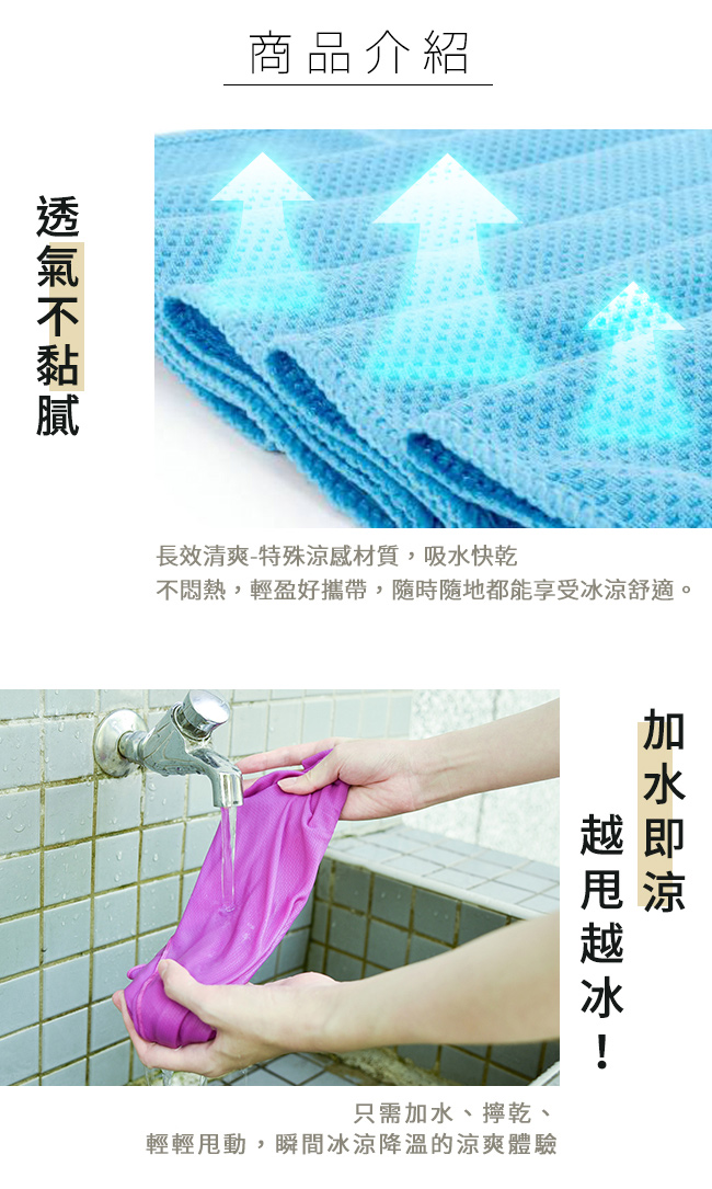 加水、擰乾、輕輕甩動,瞬間冰涼降溫的涼爽體驗