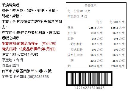 | 商品名稱 | 原味復刻-手燒烤魚卷85g(12包) |