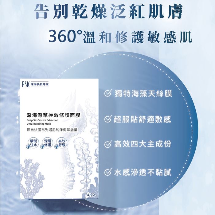 | 商品名稱/包裝內容規格 | 【PSK 深海美肌專家】深海源萃極效修護面膜4片/盒 3入組 |
