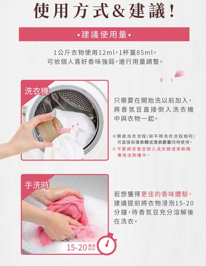 | 用途 | 芳香柔軟衣物,適用於棉、毛料、絲綢、化學纖維 |