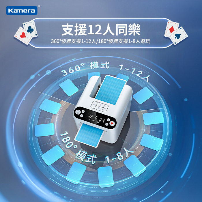 - 支援360度旋轉發牌、順/逆時針發牌、搖擺發牌、均分發牌