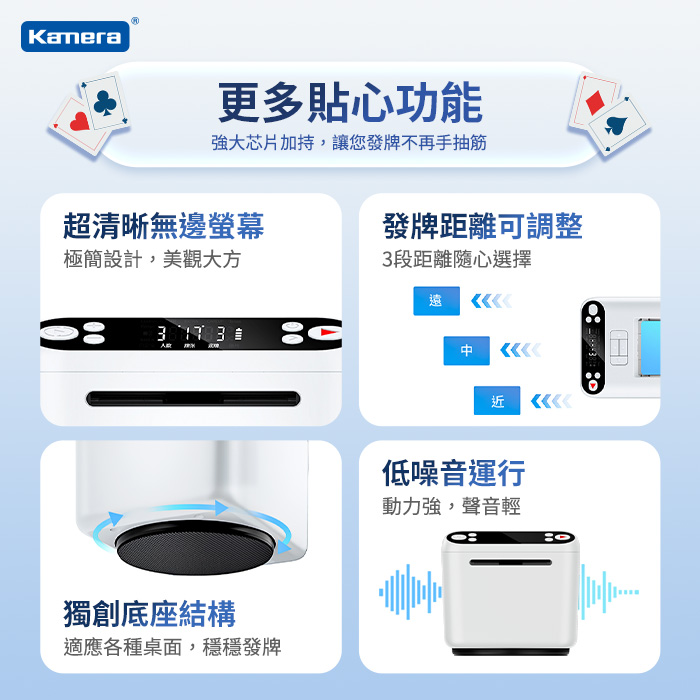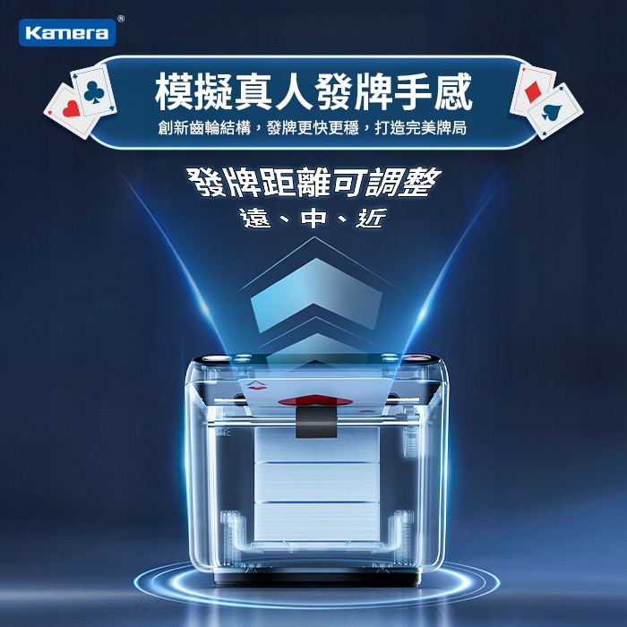 - 模擬真人發牌手感,可調整發牌距離:遠/中/近,創新齒輪結構,發牌更快更穩,打造完美牌局