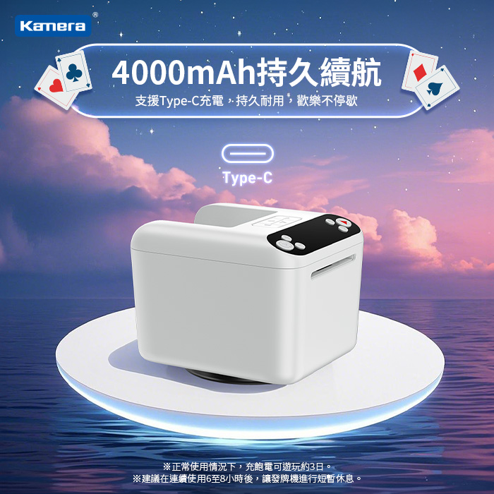 ※在正常使用情況下,充飽電後約可遊玩3日。建議在連續使用6至8小時後,讓發牌機進行短暫休息。