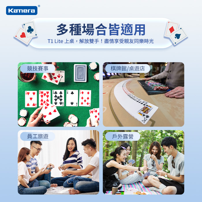 - 內建德州撲克玩法,完美支援每一場牌局,T1 Lite 就是您的專屬荷官