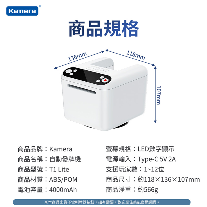 | 【商品名稱或型號】 | 【Kamera】撲克牌自動發牌機(T1 Lite) |