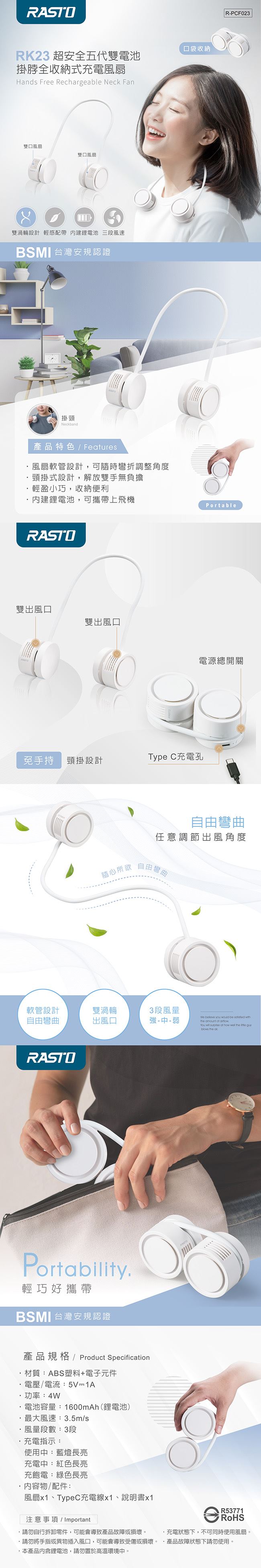 | 商品名稱 | RASTO RK23 超安全五代雙電池掛脖全收納式充電風扇 |