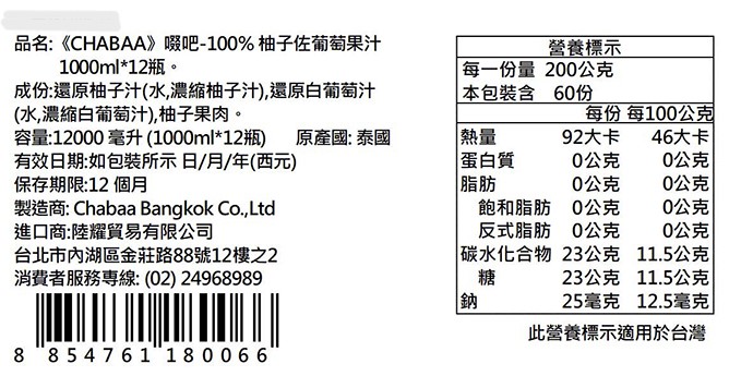 | 商品名稱 | 《CHABAA》啜吧-100% 柚子佐葡萄果汁1000ml/瓶*12瓶 |