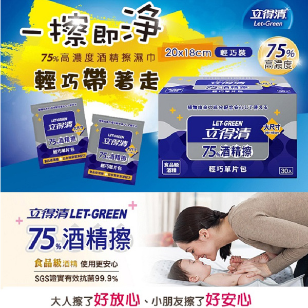 | 包裝內容/商品規格 | 立得清 75%酒精擦濕紙巾(單片包30片-輕巧包)X24入 | |
