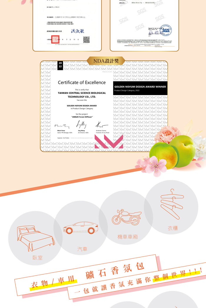 | 注意事項 | 1.請放置陰涼處遠離高溫日曬及火源。 2.請勿開封香氛袋本體,且勿使用於人體上。 3.本產品不可食用,若不慎誤食造成不是請盡速就醫。 |