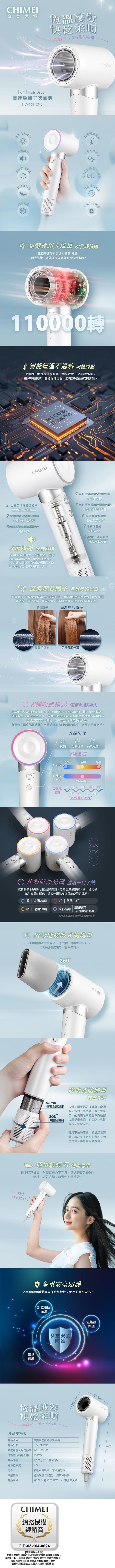 | 商品名稱 | 【CHIMEI奇美】高速負離子智能恆溫吹風機 HD-15HCN0 |