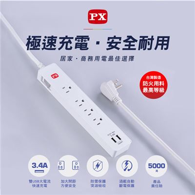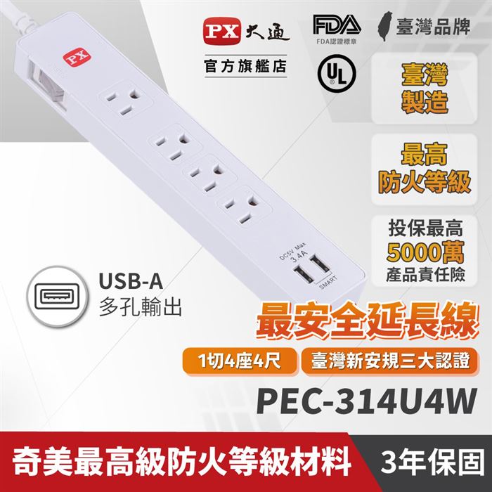| 商品名稱 | 【PX大通】1切4座4尺+2USB電源延長線(1.2公尺) PEC-314U4W |