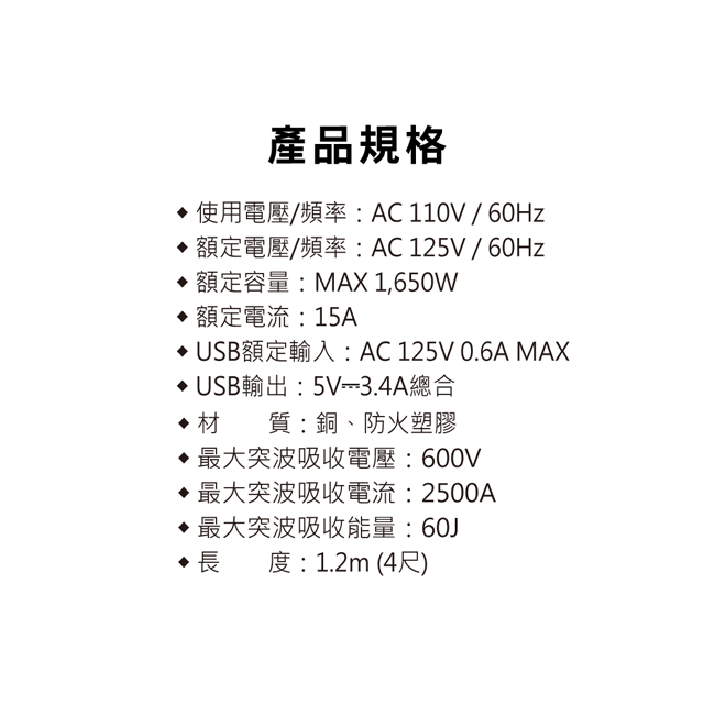 商品規格:1個切換開關、4個電源擴充座、2個USB-A充電座