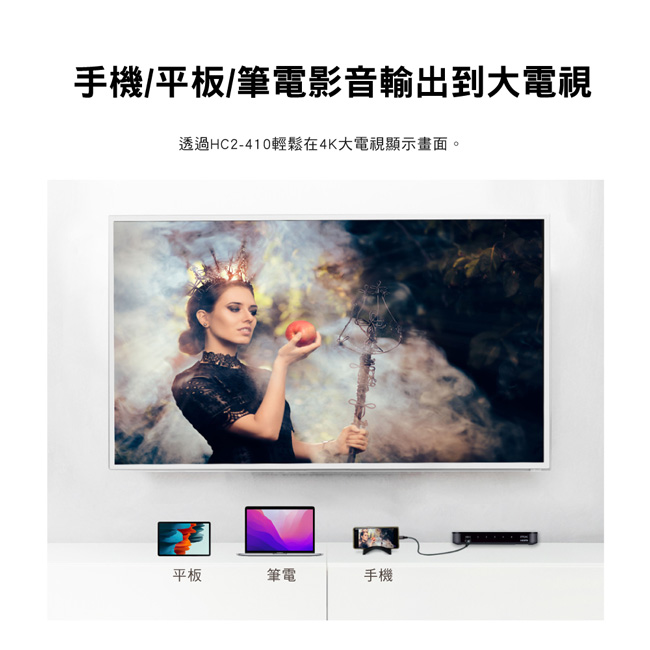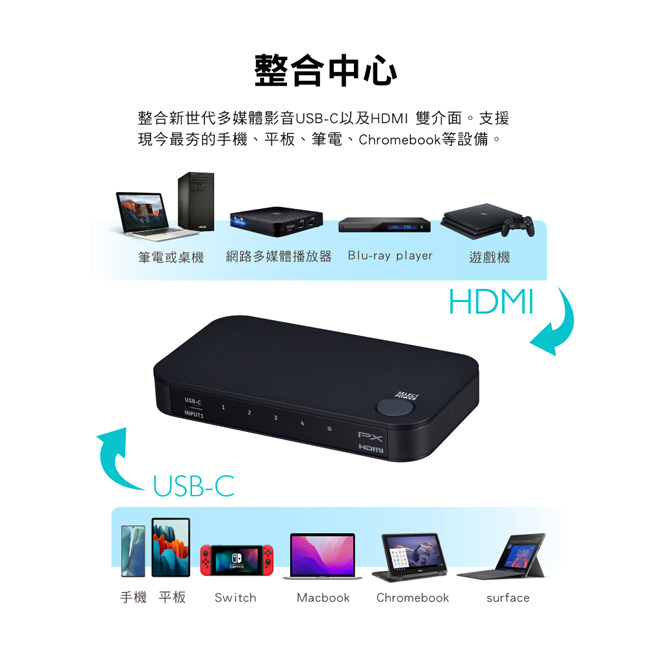 *整合中心:整合新世代手機、平板USB TYPE C以及傳統HDMI影音設備