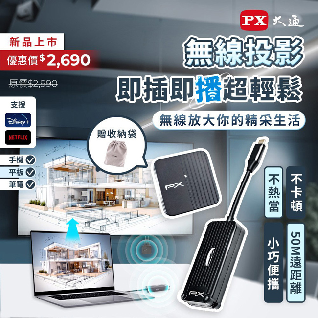 | 商品名稱 | 【PX大通】無線投影Type C行動無線影音傳輸器 WTR-1500C |