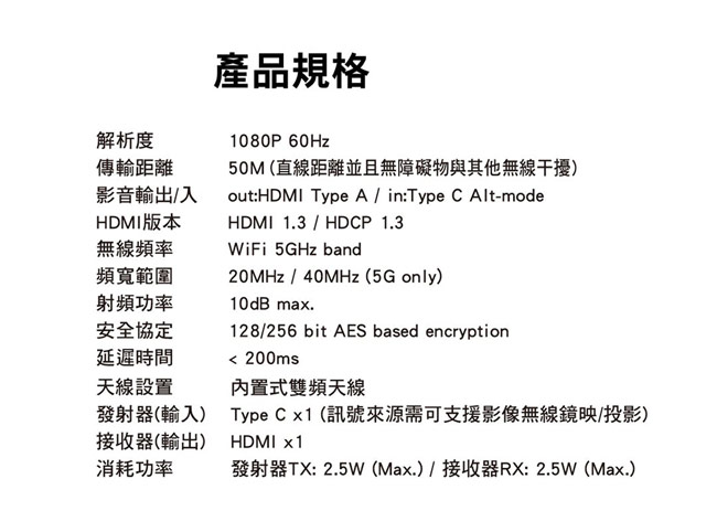 動作電源供應:發射器TX:5V/0.5A (USB-C),接收器RX:5V/0.5A (USB-C)