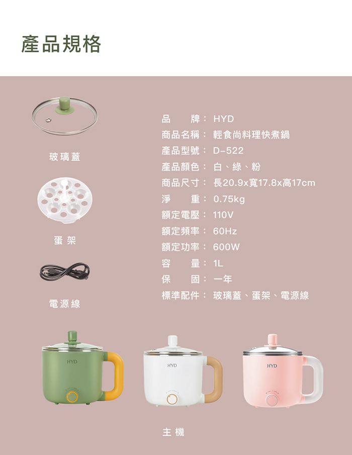 | 商品名稱 | HYD 輕食尚料理快煮鍋(附蒸蛋架) D-522 |