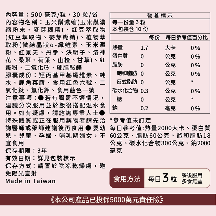內容物名稱:玉米鬚濃縮(玉米鬚濃縮粉、麥芽糊精)、紅豆萃取物(紅豆萃取物、麥芽糊精)、植物萃取粉(微結晶狀α-纖維素、玉米澱粉、紅景天、丹參、決明子、洛神花、桑葉、荷葉、山楂、甘草)、紅棗粉、二氧化矽、硬脂酸鎂 膠囊成份:羥丙基甲基纖維素、純水、鹿角菜膠、食用紅色六號、二氧化鈦、氯化鉀、食用藍色一號 |