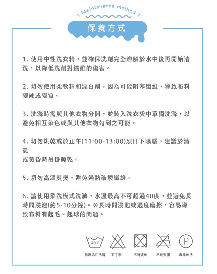 | 保存方法 | ◆注意事項: .清潔保養方式:可水洗、可乾洗、不可漂白、不可烘乾。 .建議清洗時,先將洗劑溶解於水中,再將床寢放入大型洗衣袋後再清洗。 .本商品不含拍攝道具,以「產品內容」為主。 |