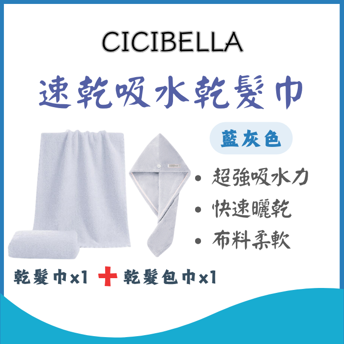 【CICIBELLA】乾髮巾藍灰色2件組 (乾髮巾*1+乾髮包巾*1)