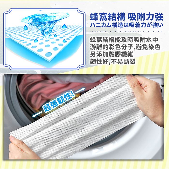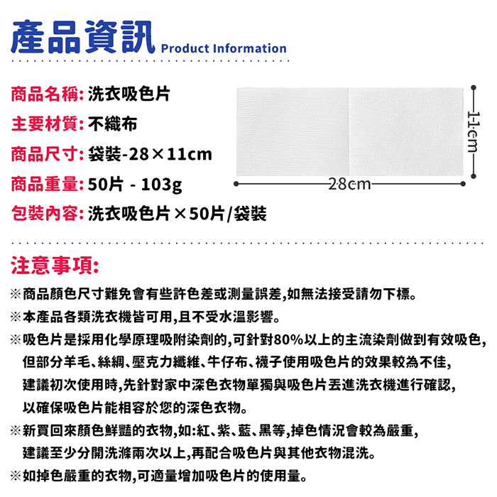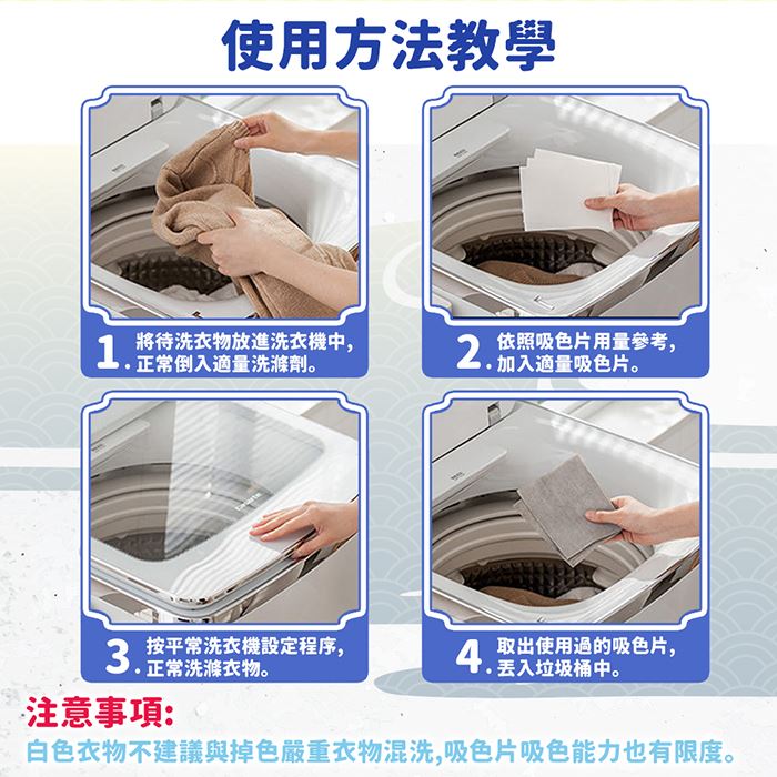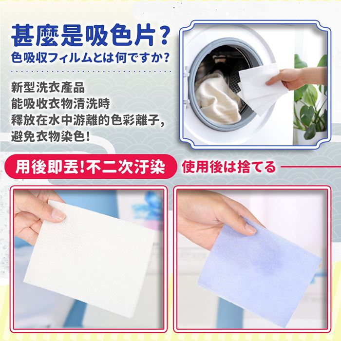 | 注意事項 | ※白色衣物不建議與掉色嚴重衣物混洗,吸色片吸色能力也有限度。 ※本產品各類洗衣機皆可使用,且不受水溫影響,洗衣機中衣物不可塞太滿,以免影響效果。 ※吸色片是採用化學原理吸附染劑的,可針對80%以上的主流染劑做到有效吸色,但部分羊毛、絲綢、壓克力纖維、牛仔布、襪子使用吸色片時效果較為不佳,建議初次使用時,先針對家中深色衣物單獨與吸色片丟進洗衣機進行確認,以確保吸色片能相容於您的深色衣物。 ※新買回來顏色鮮豔的衣物,如:紅、紫、藍、黑等,掉色情況會較為嚴重,建議至少分開洗滌兩次以上,再配合吸色片與其他衣物混洗。 ※如掉色嚴重的衣物,可適量增加吸色片的使用量。 ※產品因環境光線、相機參數、螢幕發色的不同,可能有些許誤差,請依實物為準。 ※產品尺寸為手工測量會有些許誤差,依實物為準。 |