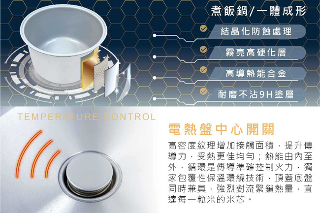*鋁製內鍋傳熱效能好,不沾米粒清