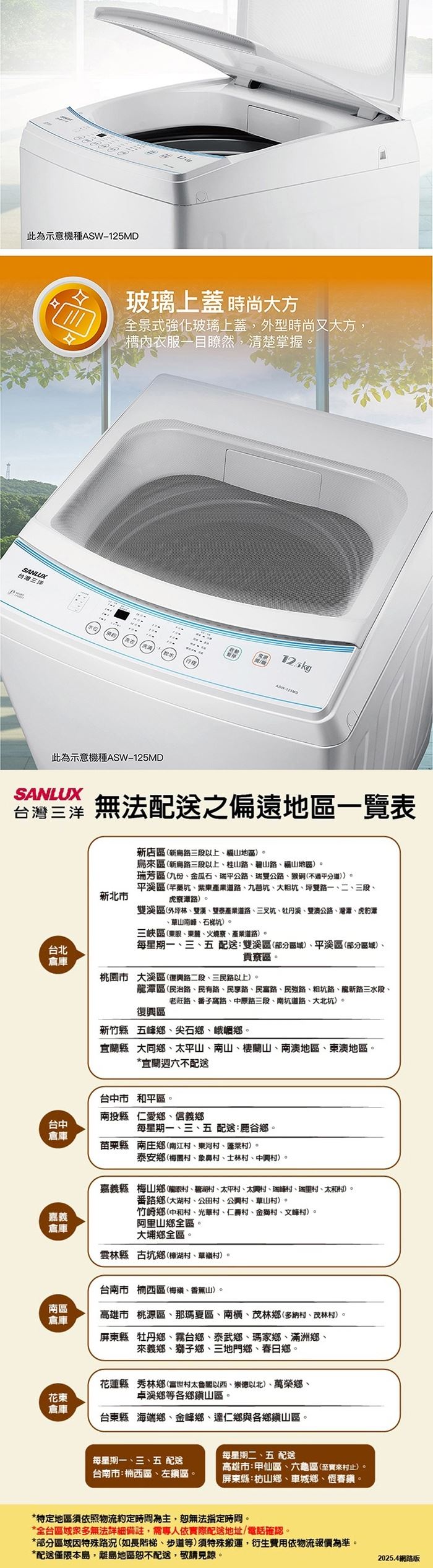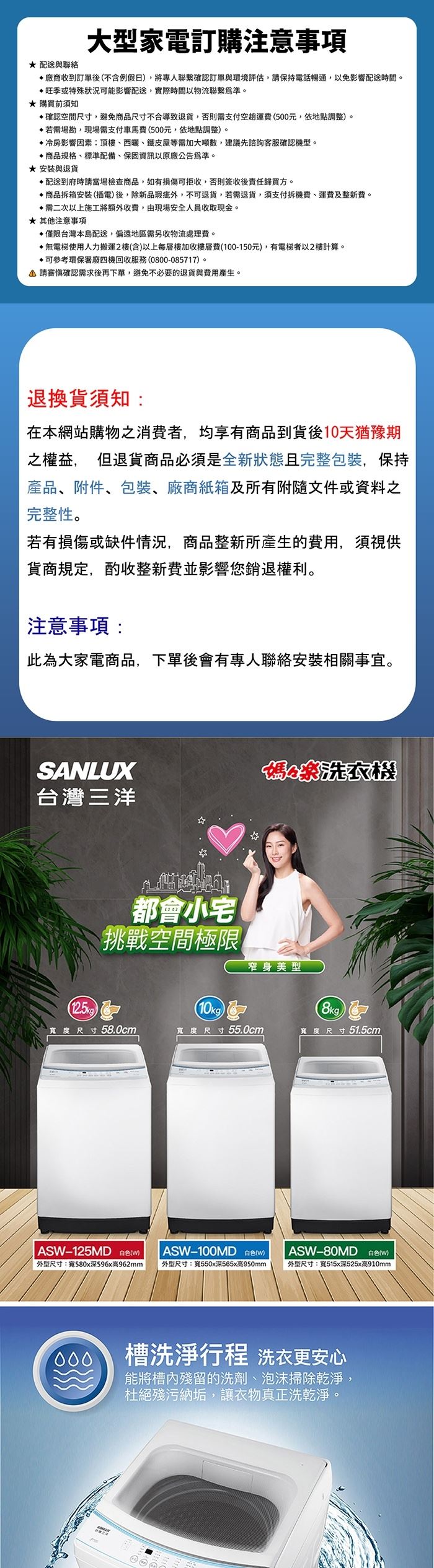 | 商品名稱 | 【SANLUX 台灣三洋】12.5KG直立式洗衣機(ASW-125MD) |