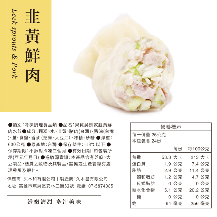 嚴選契作牧場健康豬、台灣小農種植滑嫩鮮甜韭黃,內餡飽滿、濃郁多汁,