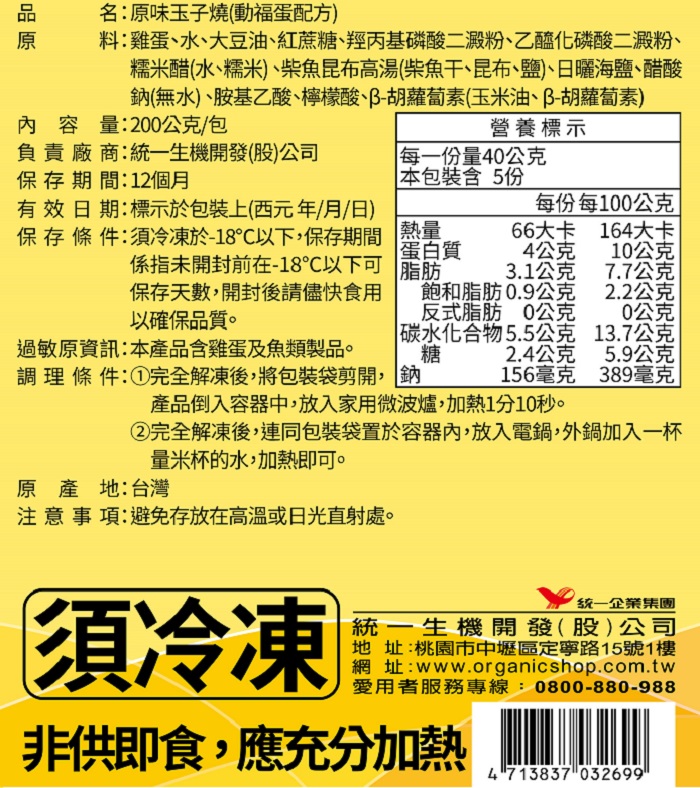 | 商品名稱 | 統一生機-原味玉子燒(動物蛋配方) |