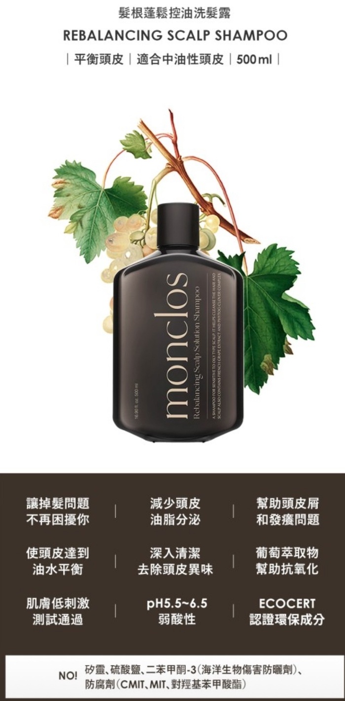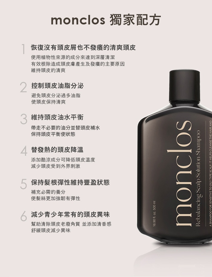 | 商品名稱/包裝內容規格 | 【MONCLOS】髮根蓬鬆控油洗髮露500ml+酪梨深層護髮膜200ml[2件組] |
