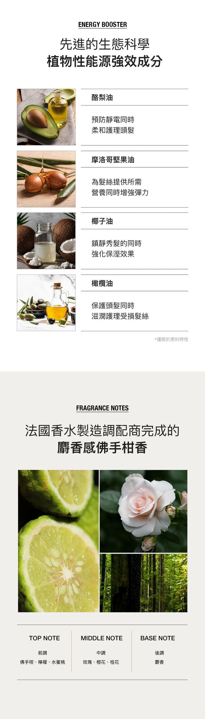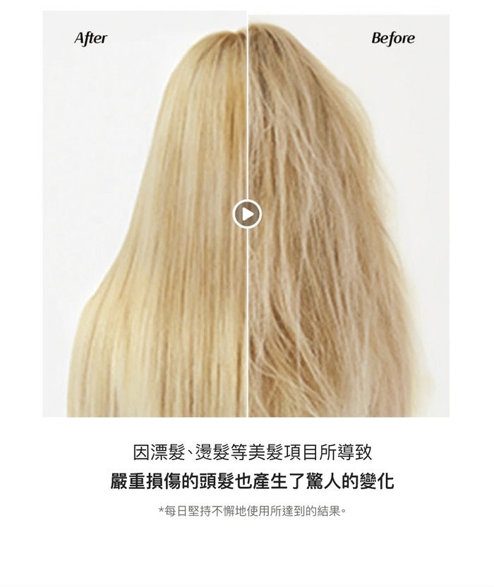 | 使用方法 | 先用清水把頭髮完全打濕,並持續用水略沖淨汙垢後,把洗髮精適量倒在手掌上,將洗髮精搓揉起泡後,再抹在頭髮上並用指腹輕輕按摩頭髮,搓揉出泡沫後再用清水將洗髮精沖掉,取適量護髮膜均勻塗抹於頭髮後,再以清水洗淨。 |