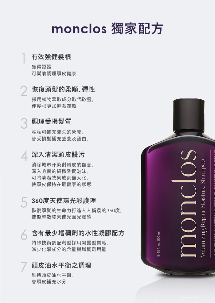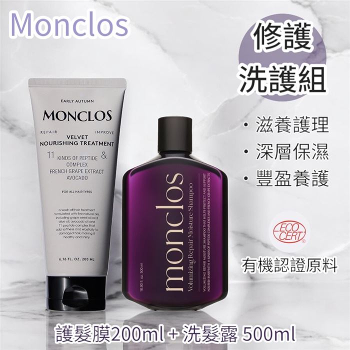 | 商品名稱/包裝內容規格 | 【MONCLOS】髮根蓬鬆修護洗髮露500ml+酪梨深層護髮膜200ml[2件組] |