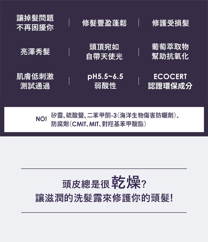 | 使用方法 | 先用清水把頭髮完全打濕,並持續用水略沖淨汙垢後,把洗髮精適量倒在手掌上,將洗髮精搓揉起泡後,再抹在頭髮上並用指腹輕輕按摩頭髮,搓揉出泡沫後再用清水將洗髮精沖掉,取適量護髮膜均勻塗抹於頭髮後,再以清水洗淨。 |