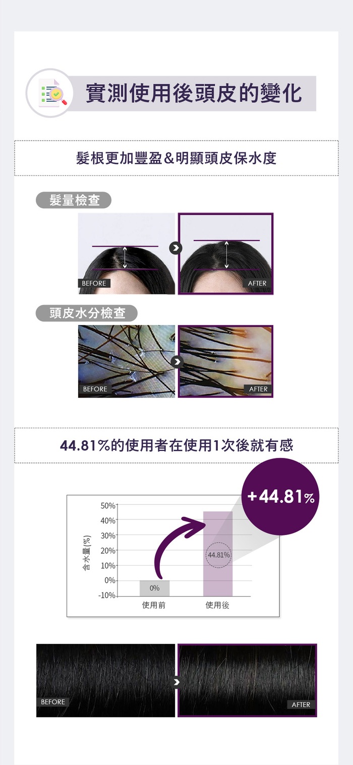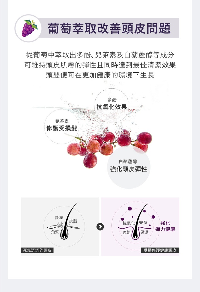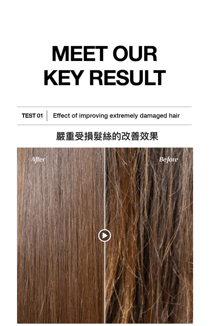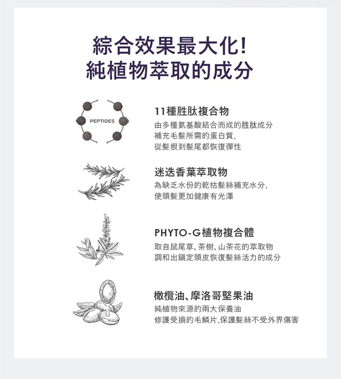 由多種氨基酸結合而成的胜肽成分,補充毛髮所需的蛋白質,從髮根到髮尾都恢復彈性,