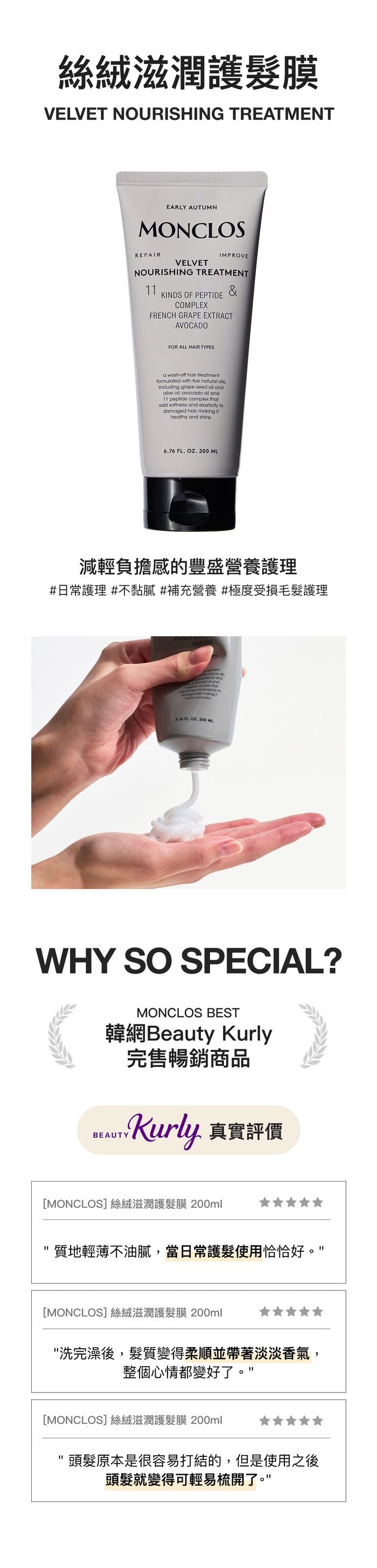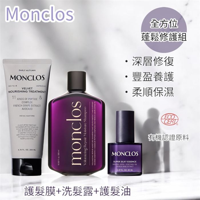 | 商品名稱/包裝內容規格 | 【MONCLOS】髮根蓬鬆修護(護髮膜+洗髮露+護髮油)[3件組] |