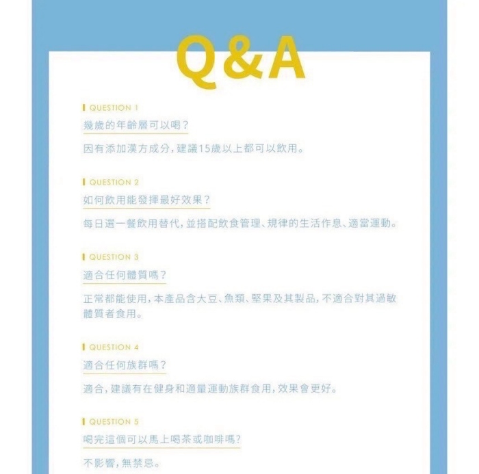 | 注意事項 | ◎開封後請立即飲用完畢 ◎本產品含有奶類、豆類及其製品,不適合對其過敏體質者飲用 ◎奶蛋素可食用,全素不行 ◎孕婦、哺乳期婦女、有特殊體質者,建議使用前先諮詢醫師專業評估 ◎請放置兒童不易取得之處 |