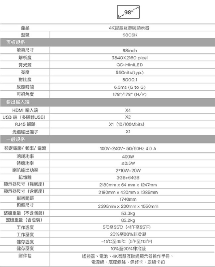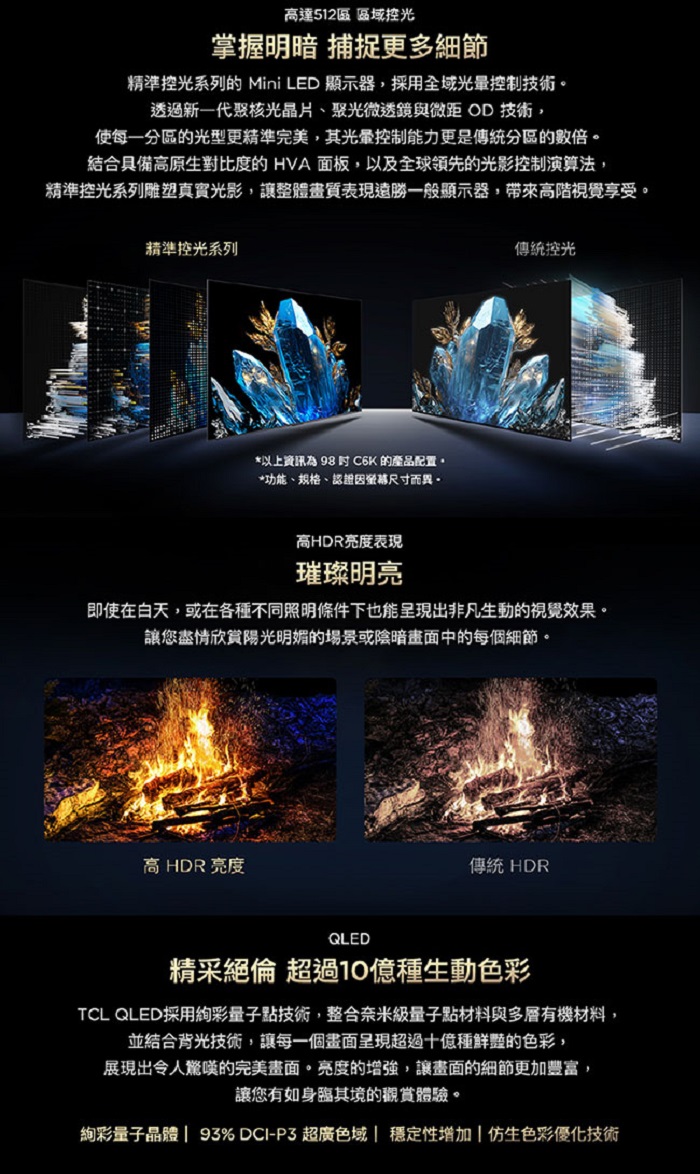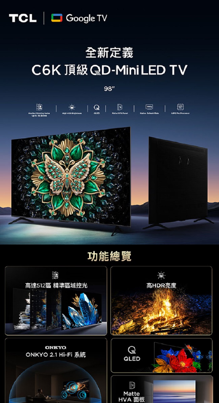 | 商品名稱 | TCL 98吋 C6K QLED Google TV 量子智能連網液晶顯示器(98C6K) |