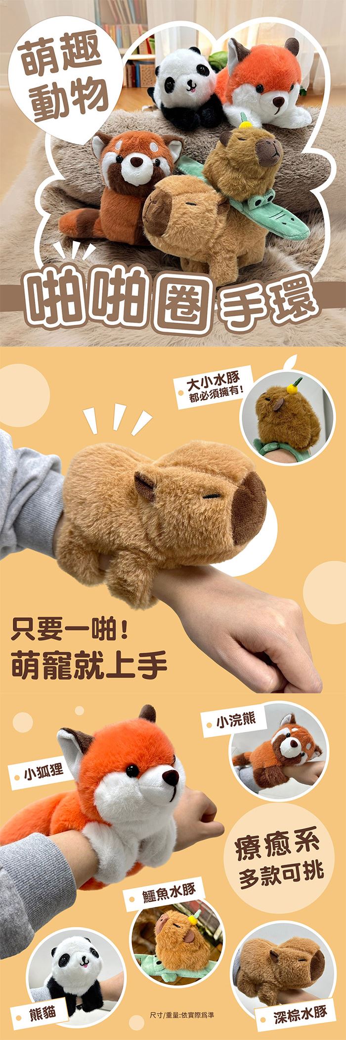 | 包裝內容/商品規格 | 鱷魚水豚-尺寸:12.3x6x8.5cm / 重量:41g 深棕水豚-尺寸:16x11x7cm / 重量:79.5g 小浣熊-尺寸:17x12x7cm / 重量:87g 熊貓-尺寸:14.5x10x9cm / 重量:71.8g 小狐狸-尺寸:16.8x10.3x11cm / 重量:92.3g |