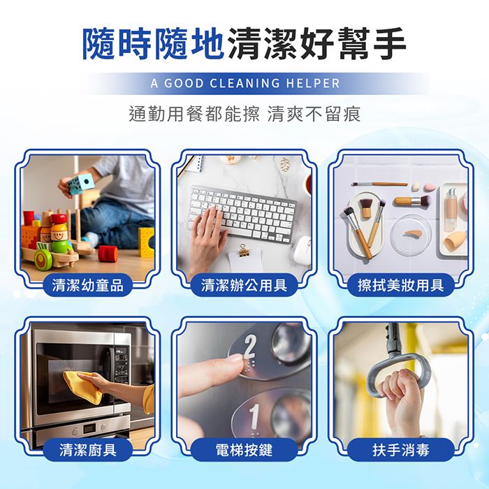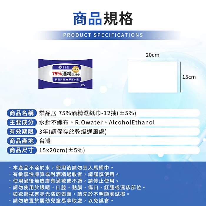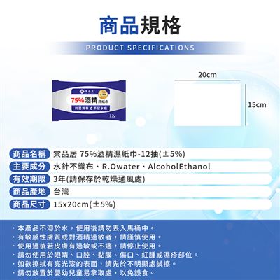 | 注意事項 | ※本產品不溶於水,使用後請勿丟入馬桶中。 ※有敏感性膚質或對酒精過敏者,請謹慎使用。 ※使用過後若皮膚有過敏或不適,請停止使用。 ※請勿使用於眼睛、口腔、黏膜、傷口、紅腫或濕疹部位。 ※如欲擦拭有亮光漆的表面,請先於不明顯處試擦。 ※請勿放置於嬰幼兒童易拿取處,以免誤食 ※商品尺寸為手工測量會有些許誤差敬請見諒。 ※商品因環境光線、螢幕顯色的不同,可能會有些許色差,請以實際收到商品為準。 |