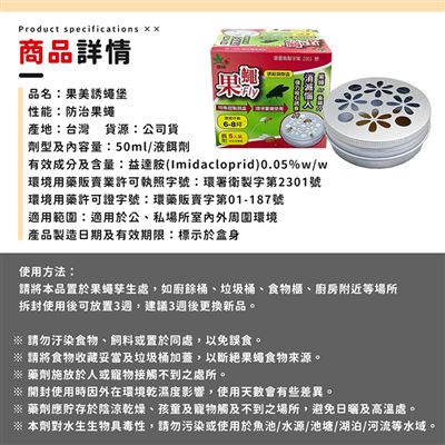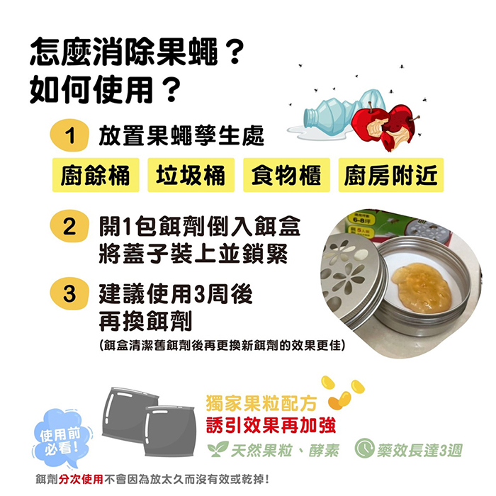 | 保存方法 | 請放置於陰涼乾燥、兒童無法觸及之處 ◆ 使用方法:請將本品置於果蠅孳生處,如廚餘桶、垃圾桶、食物櫃、廚房附近等場所 拆封使用後可放置3週,建議3週後更換新品。 果蠅劑分次使用不會因為放太久而沒有效或乾掉! |