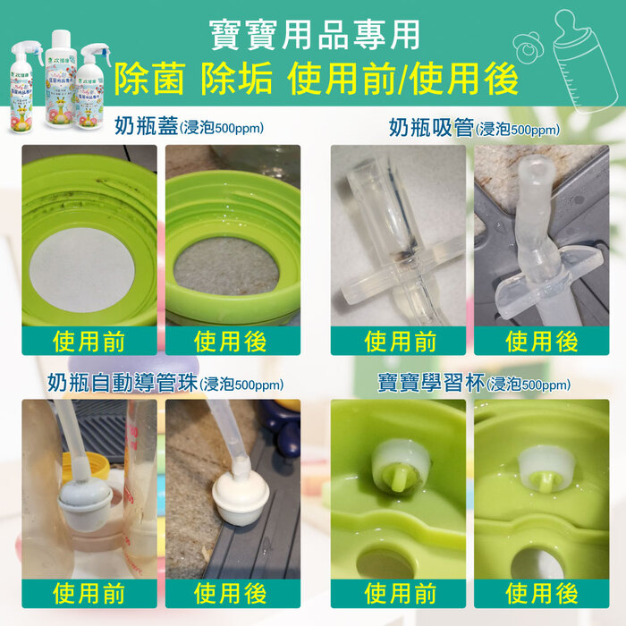 本品為外用噴灑,如不慎入口,吐出即可。兒童請在成人指導下使用,使用後瓶蓋鎖緊。 【適用範圍】全民適用且適用於多種場合 【使用方法】 寶寶用品專用 🔷500ml可直接噴灑物品無需過清水,待自然乾燥或以紙巾擦拭即可。 🔷濃縮1L液請參照使用說明稀釋後使用哦。 🔷浸泡:用於奶瓶、蔬果、食器及玩具.....等清潔。作用完即還原成水及食鹽,對環境友善,無汙染、無化學殘留。 浸泡蔬果、去除擾人的頑固汙垢、黃斑…等,六大功能:除菌、除臭、保鮮、清潔、去汙、除垢、漂白。如:孩子吐奶、夜晚尿床、衣物黃斑、奶嘴處處卡垢等問題,物品浸泡約10-20分鐘或睡前浸泡隔天使用。 🔷乾洗手液:免水洗,噴於手部做肌膚清潔 |