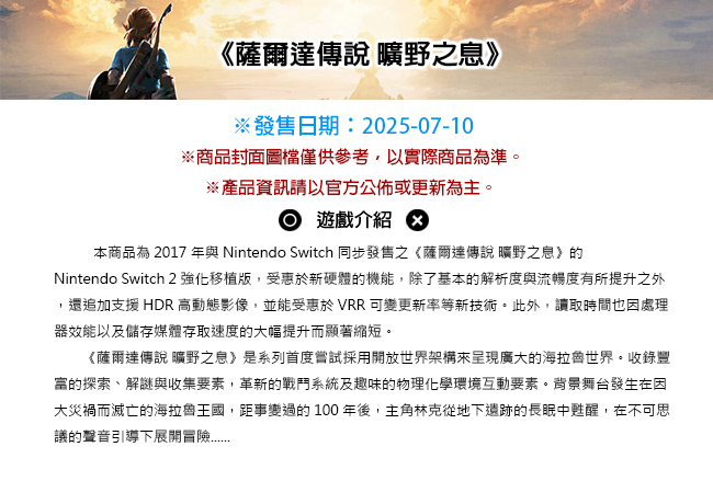 | 商品名稱 | NS2 薩爾達傳說 曠野之息 中文版 |