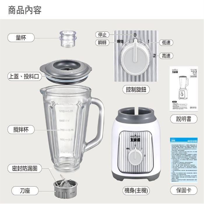 | 內容物 | 果汁機主機(含電源線)、攪拌杯 |