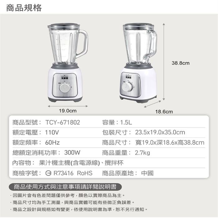 | 商品名稱 | 【 大家源 】1.5L碎冰果汁機 TCY-671802 |