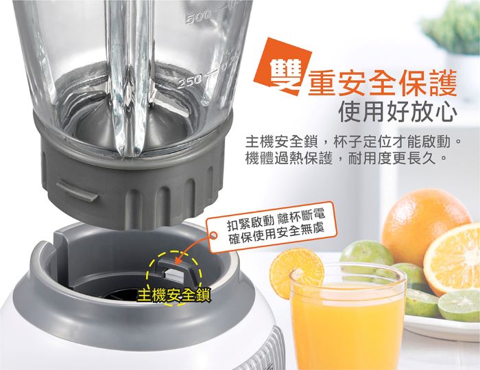 | 材質 | ABS樹脂-外殼、上蓋; PP樹脂-底座、杯蓋、上機身、刀座;玻璃-果汁杯杯體;301不鏽鋼-刀片 |