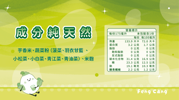 | 內容物(完整成份/食品添加物) | 芋香米、蔬菜粉(菠菜、羽衣甘藍、小松菜、小白菜、青江菜、青油菜)、米麴 |