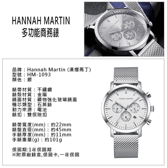 | 【商品規格】 | 品牌:Hannah Martin (漢娜馬丁) 型號:HM-1093 顏色:藍、銀、黑 錶帶材質:不鏽鋼 錶殼材質:金屬 面材質:礦物強化玻璃鏡面 機芯類型:石英錶 動力來源:電池 錶扣:雙保險扣 錶帶寬度(mm):約22mm 錶盤直徑(mm):約45mm 手錶厚度(mm):約11mm 手錶重量(g):約101g |