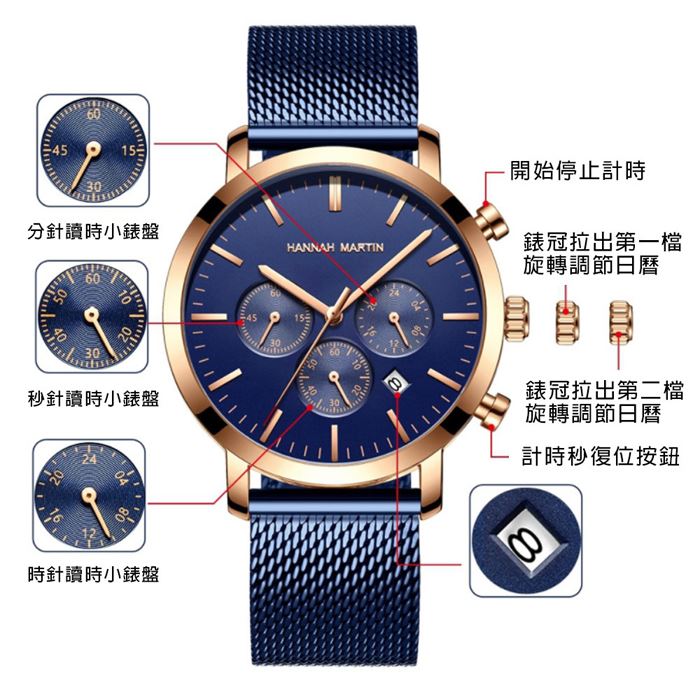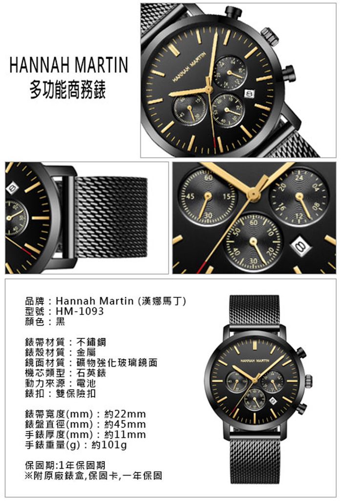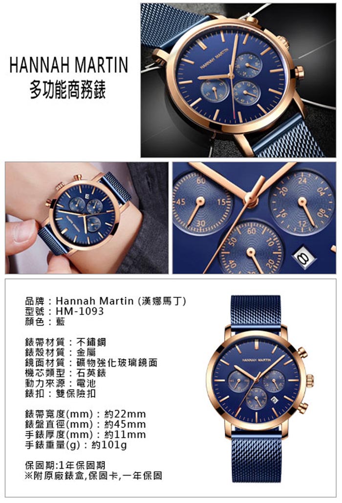 | 【商品名稱】 | 【HANNAH MARTIN 漢娜馬丁】多功能商務錶(HM-1093) - 3色可選 [公司貨] |